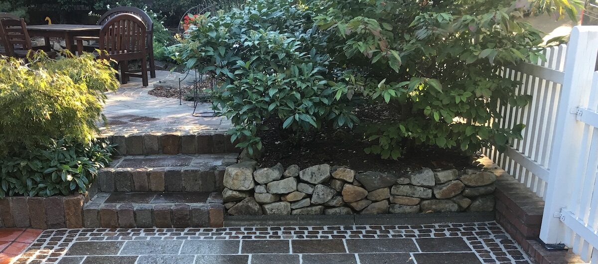 Porphyrplatten mit Kleinpflaster-Einfassung, Trockenmauer und Naturstein-Stufen.