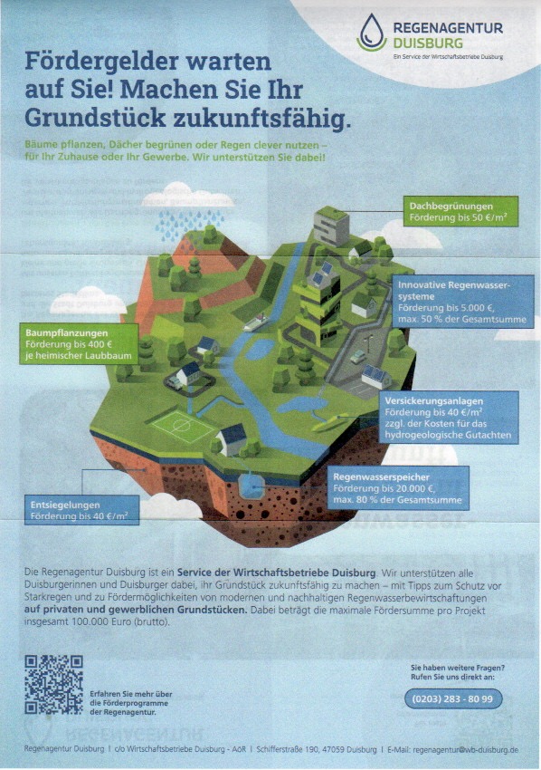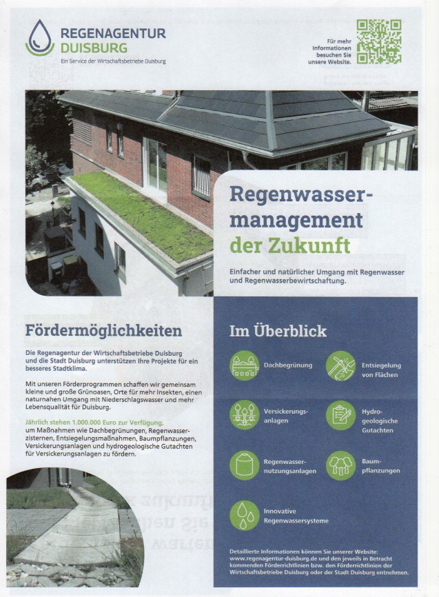 Die Regenargentur Duisburg, ein Service der Wirtschaftsbetriebe Duisburg, fördert moderne und nachhaltige Regenwasserbewirtschaftungen auf privaten und gewerblichen Grundstücken in Duisburg. Dazu gehören unter anderem Dachbegrünungen, Baumpflanzungen und Entsiegelungen von Flächen.